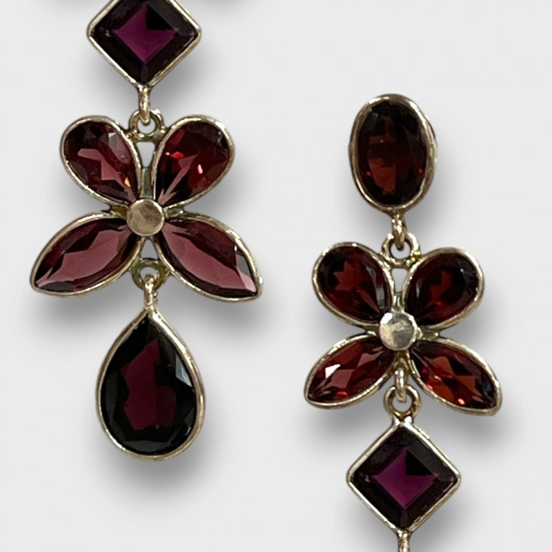 Brinco Flores longo de granada facetada, em prata 925.