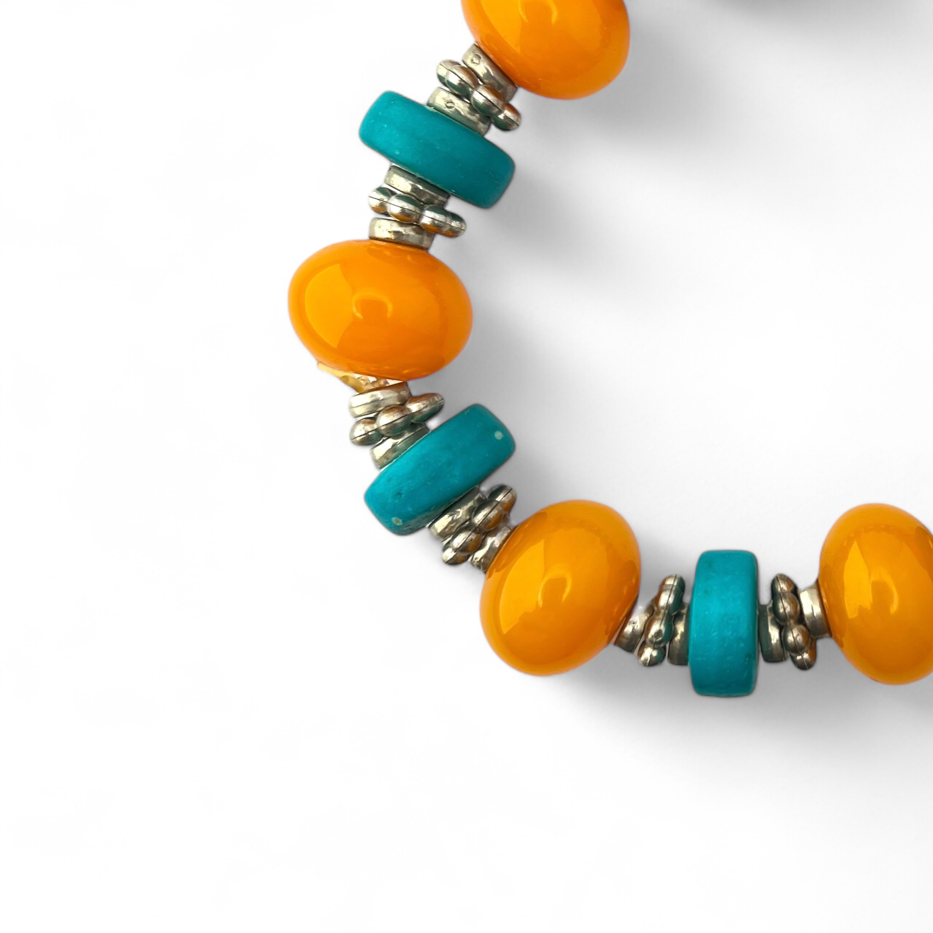 Pulseira em resina nas cores âmbar e azul entremeada em metal.
