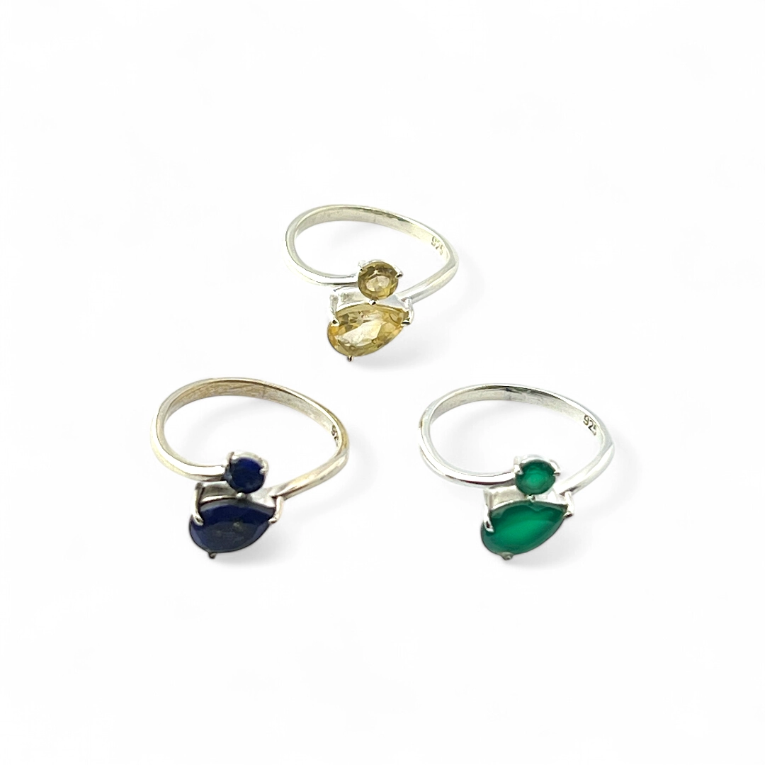 Anel com 1 pedra oval e outra redonda, todo em prata 925