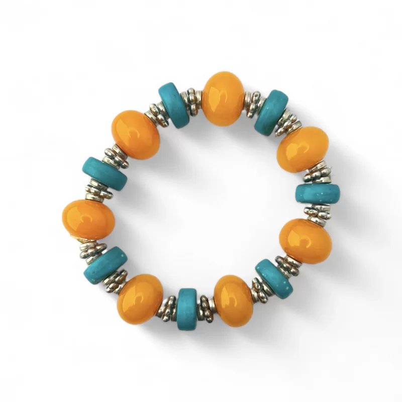Pulseira em resina nas cores âmbar e azul entremeada em metal.