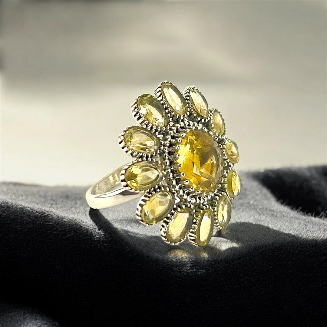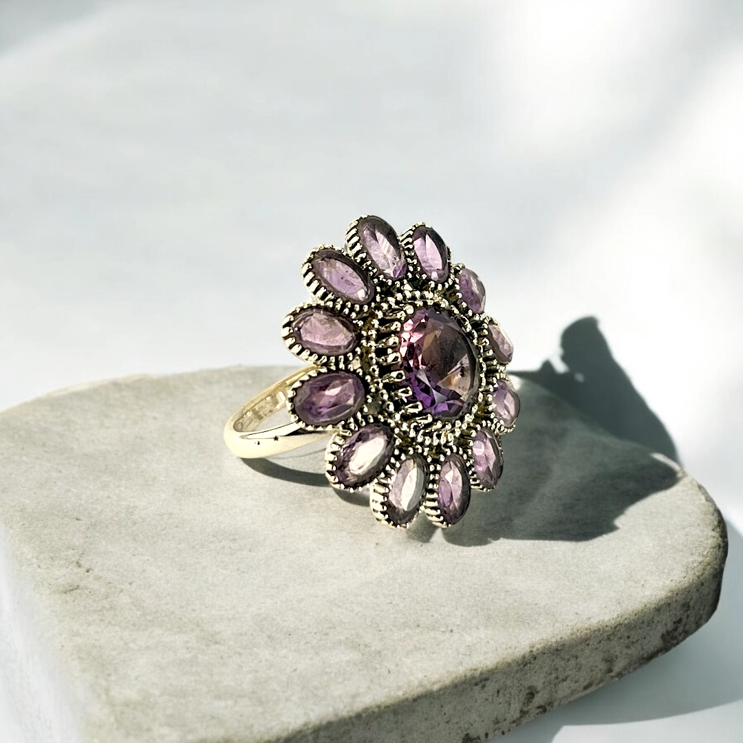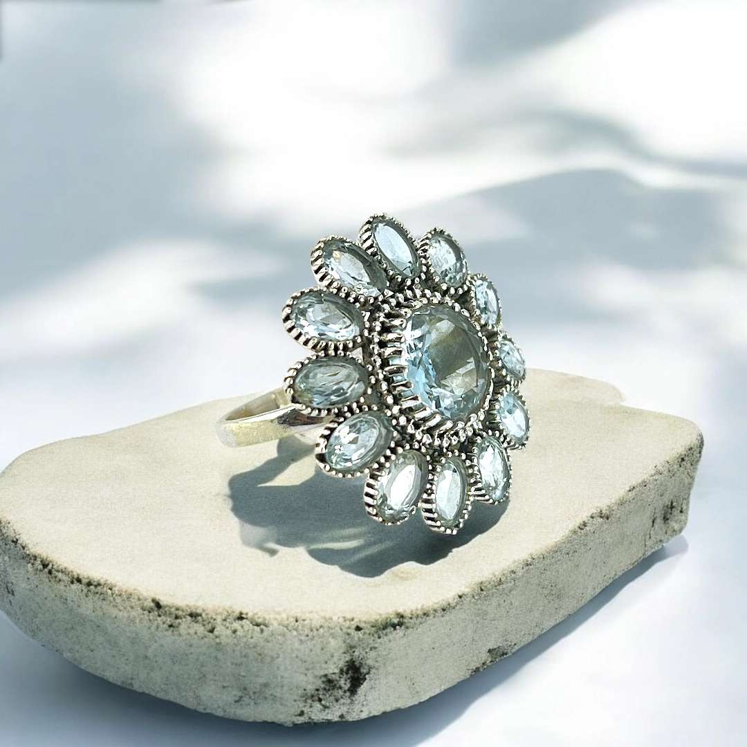Anel flor redondo com trabalho em prata 925, varias pedras
