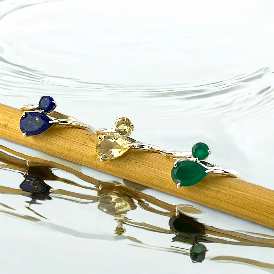 Anel com 1 pedra oval e outra redonda, todo em prata 925